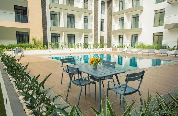 Studio Apartments, with a Pool, Gym and a Restaurant, not far from the Airport.