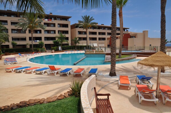 La propiedad es arbolada y bien mantenido. Disfrutar de acceso a 3 piscinas con vistas al mar: una gran piscina, piscina para niños y una piscina climatizada.