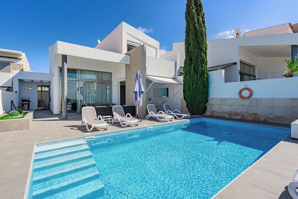 Villa Caterina, situada en La Caleta, Adeje, ofrece un alojamiento de 400 m2 con vistas al mar, 5 dormitorios, 3 baños, jardín privado con piscina privada climatizada al aire libre, barbacoa, aparcamiento privado gratuito, TV de pantalla plana con canales vía satélite, zona de comedor, cocina totalmente equipada, balcón con vistas a la piscina, conexión Wi-Fi gratuita, aire acondicionado. Villa Caterina es ideal para los amantes del golf (a pocos metros) y los amantes del mar (¡el océano está justo enfrente!). Cuarto de lavado y cuarta habitacion / cuarto de servicio se encuentran en el sótano con baño propio (ideal para niñera o niños). Ropa de cama y toallas de baño y piscina incluidas. La Villa está ubicada en una urbanización elegante y tranquila a pocos pasos del campo de golf de Costa Adeje y tiene vistas a las hermosas playas de la costa sur de Tenerife (Playa del Duque, Playa de la Enramada y muchas otras). A dos kilómetros se encuentra el pueblo de La Caleta, con sus bares y restaurantes. El volcán Teide, que domina la isla, ofrece oportunidades únicas para practicar senderismo, parapente y ciclismo. A pocos Kms se encuentra el Siam Park, uno de los mejores parques acuáticos del mundo, y no obstante, el parque natural Loro Parque, donde entre las fantásticas atracciones, en hermanamiento con el parque acuático de la ciudad de Miami, ofrece espectáculos con delfines, leones marinos y orcas.