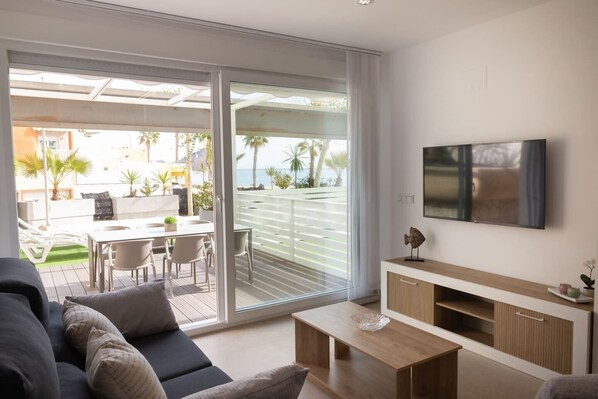 El salón, luminoso y con vistas laterales al mar, cuenta con Smart TV de 50” y Orange TV (90 canales). El sofá cama italiano abatible (135×190) añade un plus de confort.