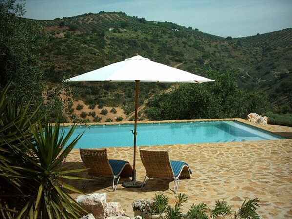 El patio comunitario y el área de la piscina son compartidos por un máximo de 10 invitados y se ubican en la ladera de la colina frente a fantásticas vistas del valle, colinas y olivares. Hay mesas y sillas para comer, o sentarse con una bebida fría y ver la puesta de sol ... ¡También hay tumbonas acolchadas para los adoradores del sol! La piscina se encuentra al borde del patio y tiene una cómoda repisa para sentarse en el agua, que le brinda un lugar para sentarse y mantenerse fresco mientras lee o simplemente contempla la vista ...
