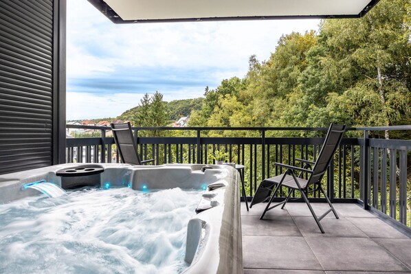La propiedad dispone de sauna privada y jacuzzi (37 °C) en el balcón; los chorros pueden usarse hasta las 22:00. Transporte público, panadería, supermercado y pizzería están a poca distancia a pie. Hay aparcamiento privado en la propiedad. Cámaras de seguridad vigilan el exterior, la entrada y los aparcamientos.