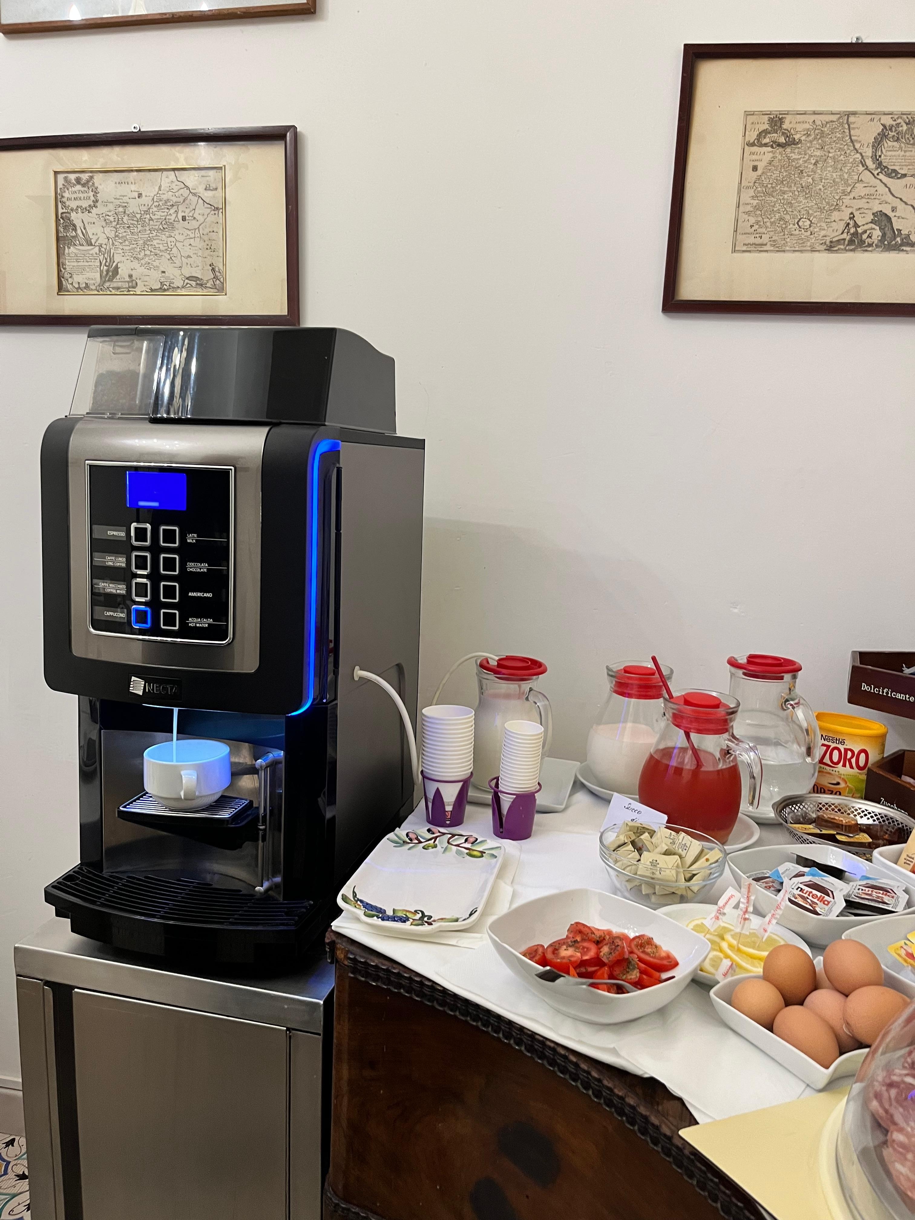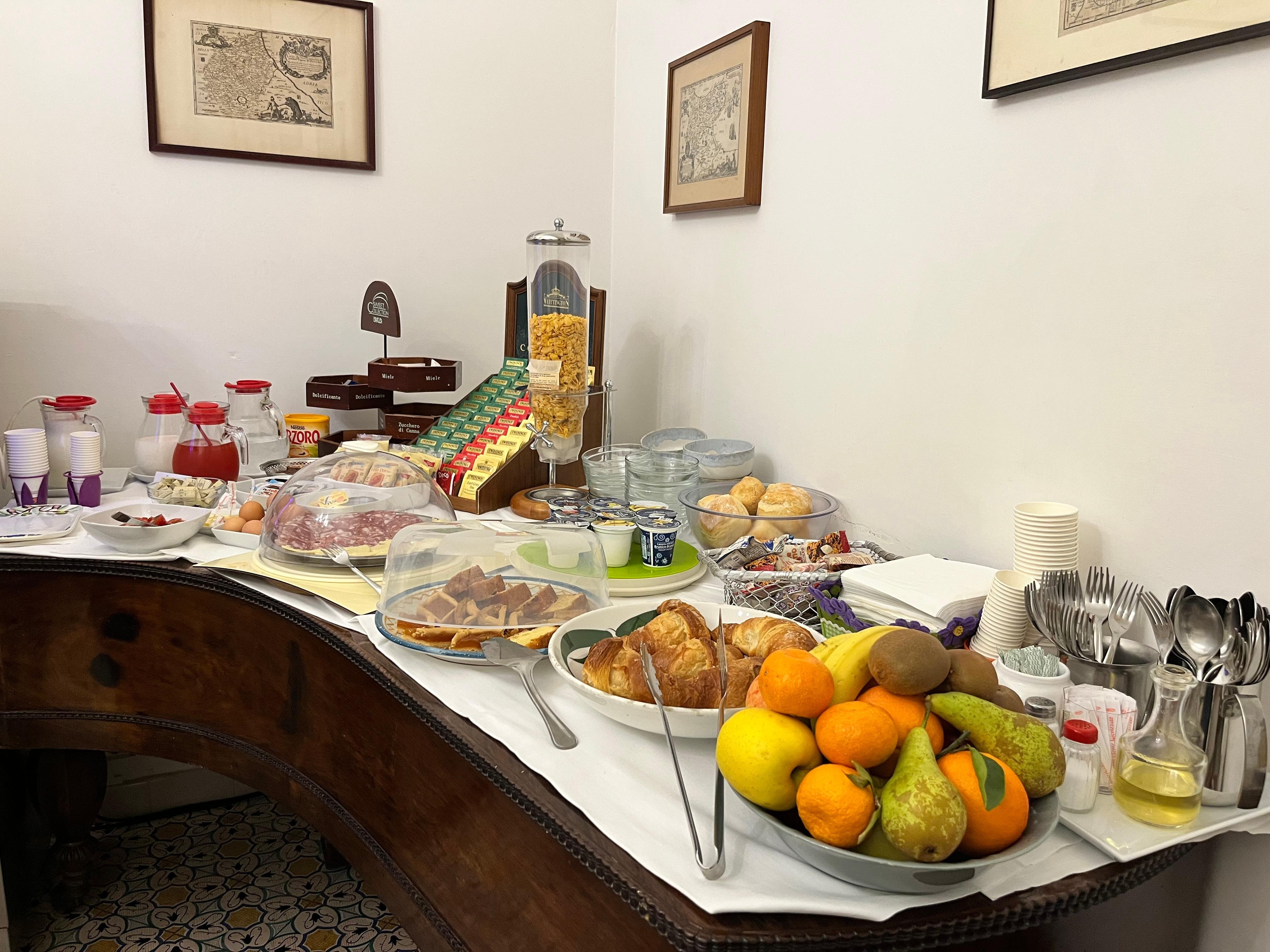 Das Frühstücksbüffet war toll! Frisches Obst im Korb zur freien Auswahl, verschiedene Kuchen, Croissants und Brötchen, Marmeladen, Nutella, Mich und sehr leckerer frisch gepresster Orangensaft, Butter, Käse und Salami, hartgekochte Eier, abgepackte Zwieback etc, Cornflakes, diverse Joghurts, frische geschnittene Tomaten, diverse Tees und ein Kaffeevollautomat, der keine Wünsche offen lässt, sogar mit frischer Milch zur Zubereitung des Cappuccinos etc.