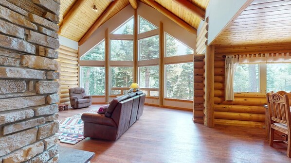 This is a well cared for home on a very private road in the Angel Fire Country Club area. This home is at approx 9480 ft so this home’s entry with no steps was great for loading and unloading. Our Ford Expedition had no trouble with the steep gravel road drive up to the road the home is on or with the steep gravel driveway down to the house. During wintry weather months, attempting this drive without 4WD is a BAD idea. We were there for two weeks. The first week was with a total of seven - Four adults and 3 kids aged 12 and under. The second week was with just the two of us. The kitchen is spacious w/ nice appliances. It’s equipped with the very basics in flatware, glassware, and cookware. (If you have a favorite bourbon or wine glass, bring it with you). The kitchen table seats four w/two at the kitchen counter so a group larger than 6 will juggle seating. The family room has wonderful windows to look at the wildlife - elk, deer, chipmunks, bear. This room will comfortable seat 5. The TV is set for Netflix and Prime so make sure you bring your log in info. No cable tv, apps only. Wi-Fi was great The comfortable King bedroom is off the family room with a very nice bath. The two queen rooms are upstairs - one VERY firm, one very soft plus queen sleeper sofa. Each bed has two pillows, we were glad we brought extras. The house is surrounded by beautiful aspen and pines, any Mountain View is through trees.