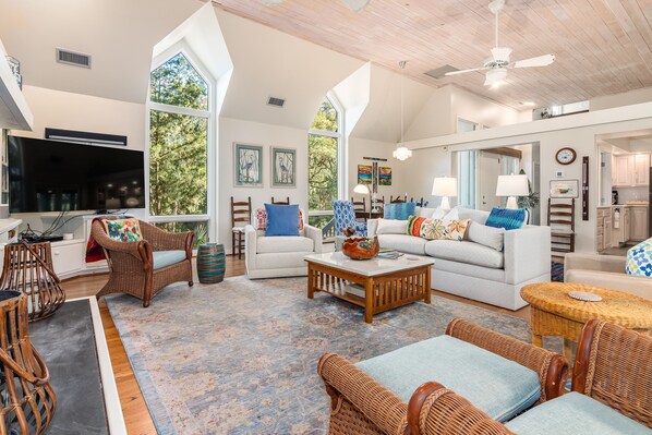 Descubra la serenidad pacífica de Bald Head Island escondida en hermosos robles vivos y mirando el hoyo # 3 en el campo de golf. Nuestra casa consta de cuatro habitaciones cada una con su propio baño completo. Tres de las habitaciones tienen camas queen size y la cuarta habitación consta de dos gemelos cada uno con un nido. Nuestra casa cuenta con un plano de planta abierto con cocina, comedor y sala de estar, todo en un solo nivel. La cocina es el sueño de los chefs. ¡Estamos completamente equipados y bien equipados! Tenemos un amplio porche con pantalla y una gran cubierta expansiva a lo largo del bosque marítimo. Estamos ubicados en medio acre, lo cual no es común en Bald Head Island. Somos muy privados, aunque a la vuelta de la esquina de la playa, el puerto y las tiendas marítimas. Tenemos muchos equipos de playa, 2 carritos de golf y wifi. Una membresía temporal de deportes / estilo de vida para el Club BHI está disponible para la compra. ¡Perfecto para los golfistas de tu familia!