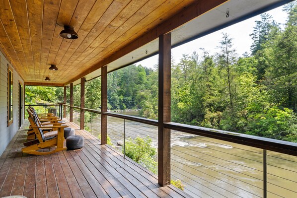 El suave murmullo del río Toccoa desde las cubiertas cubiertas lo transportará a otro lugar. CADA habitación tiene una vista panorámica del río Toccoa y el bosque nacional de Chattahoochee. Los pisos de madera y las ventanas abiertas agregan carácter al piso principal que ha sido completamente renovado, y cada detalle de diseño crea una sensación de montaña moderna, limpia y acogedora. "Aska Base Camp" es el lugar perfecto para reunirse para sus aventuras en Blue Ridge.