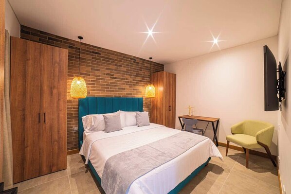 En el interior, cuenta con tres amplias habitaciones están equipadas con camas King Size Europeas de calidad hotelera y ventanas antiruido. Una habitación incluye un baño privado (ensuite), mientras que las otras dos comparten un baño completo. Dos de las habitaciones también cuentan con escritorios y sillas, facilitando el trabajo cómodo desde casa.