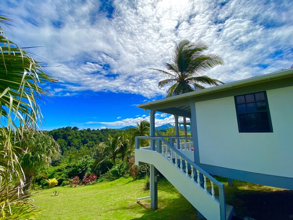Esta cabaña fue diseñada como un lugar para que una o dos personas pasen sus vacaciones. Tiene aproximadamente 500 pies cuadrados con un área de cocina completa, un baño de tres piezas, un área de comedor y un área para sentarse. Un ventilador de techo lo mantiene fresco en el raro día en que la brisa del océano no sopla. El balcón es bastante grande con una vista maravillosa de la playa y las islas de abajo. Acogedor e íntimo, es perfecto para una escapada romántica.