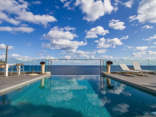 En el exterior, sobre sus terrazas y la piscina, se disfruta tanto de la brisa del mar como de unas vistas fabulosas 180 grados en todo su esplendor. Así mismo, como fue diseñada, la propiedad prácticamente desde el interior y desde cualquier estancia de la casa se puede divisar el mar.