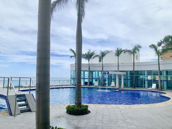 Right near the beach, secure building, nice pool, building has a store and grill for food in it