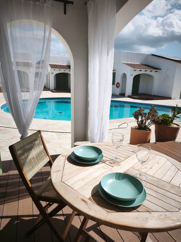Terraza privada con porche de 15 m2 con vistas a la piscina, amueblada con mesa y sillas y un par de hamacas para tomar el sol.