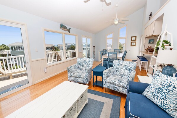 ¡Nada puede alejarte de los CABALLOS SALVAJES! Desde su cubierta tiene una hermosa vista de la comunidad, puede escuchar el sonido de las olas y ver el océano en el horizonte. A solo 450 pies de la playa, esta casa le permite a usted y a su familia disfrutar de la playa al máximo. Relájese en la bañera de hidromasaje o tome un buen libro y diríjase a la hamaca. En el interior, los techos abovedados y las grandes ventanas se suman a la sensación de amplitud de esta casa, mientras que los pisos de madera noble en la sala de estar le agregan belleza. ¡CABALLOS SALVAJES lo traerá de regreso a Corolla todos los años! Las actualizaciones de 2019 incluyeron una terraza renovada con sillas Adirondack, sillones, tronas y hamacas. Nuevo refrigerador de cocina, estufa, microondas, tostadora, ollas, sartenes, vajillas, cubiertos, vasos y otros artículos esenciales de cocina. Nuevos sofás y sillones de sala, mesa de comedor y 8 sillas, 4 televisores inteligentes nuevos (en habitaciones de nivel medio y bajo) y 5 sillas de playa nuevas.