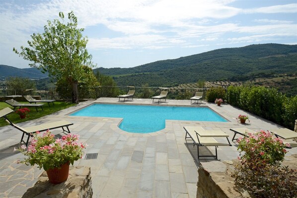 Abierta desde el último sábado de abril hasta el primer sábado de octubre, la piscina, a pocos metros de la casa, se encuentra en una hermosa terraza con vistas a las colinas de Cortona. De forma rectangular y con escalones romanos para el acceso al agua, mide 8 x 4 m con una profundidad constante de 1,25 m. Revestido en PVC de color claro con borde de piedra, tiene purificación de cloro, iluminación interna y externa y una ducha de agua fría. La zona para tomar el sol que lo rodea está equipada con hamacas y sombrillas, perfectas para garantizarle momentos de relajación.