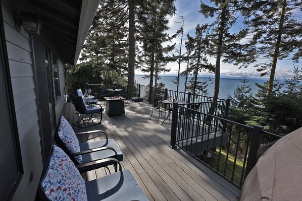 Escuche las olas desde una gran terraza y dentro de la casa. Camine por la playa por millas y descubra todas las maravillas del noroeste, desde la recolección de rocas hasta el descubrimiento de la vida marina en marea baja. Observe las impresionantes puestas de sol en un área que recibe solo la mitad de la lluvia de Seattle. Mira las luces de Port Townsend a través del sonido.