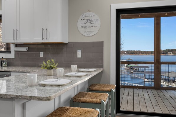 Casa de vacaciones a orillas del agua con cocina y patio