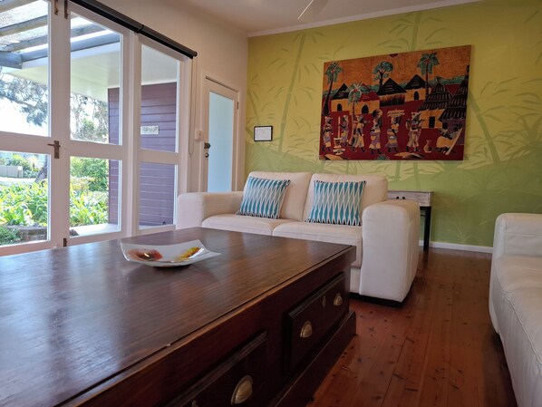 El comedor se derrama sobre la cubierta trasera que permite esa sensación interior / exterior, incluso cuando se come por dentro. El salón es amplio y acogedor. Escuchar tu iPod en nuestro sistema de sonido, ver un DVD o jugar a uno de nuestros muchos juegos de mesa.