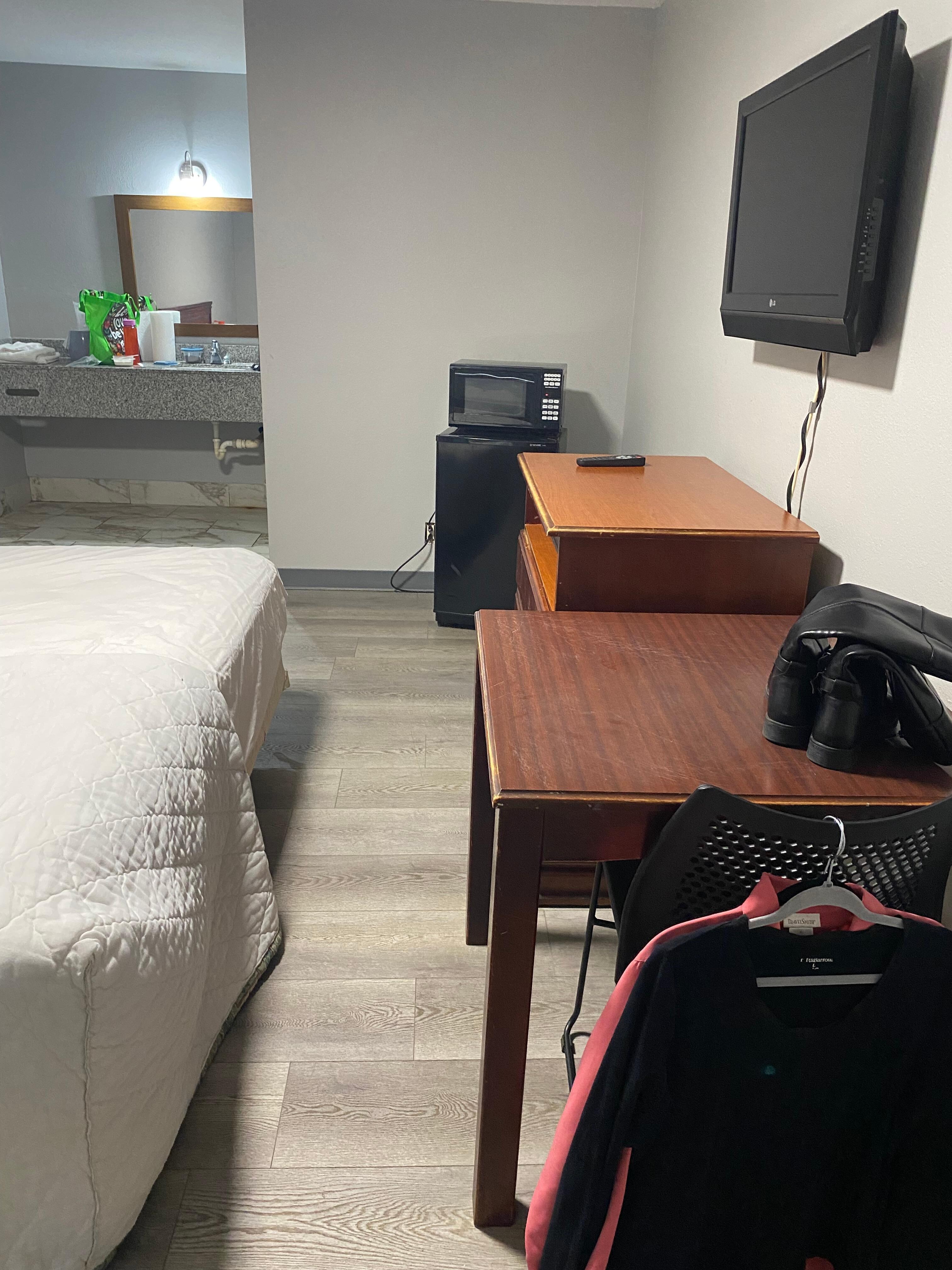I was coming through the area on a long trip and needed to rest so I pull in, pay, get my key card. I pull around to my room hoping to shower and sleep for a few hours, I only had about 12 hours before check out anyways. I grab my bags & am greeted by a man next door who was definitely under the influence of drugs. I proceed in and before I’m inside, there is a prostitute approaching me, I just go on in the room. Once I get in, I realize it is the most disgusting, horribly dirty, with holes in the walls, and the sheets were dirty, the pillowcases were brown with dog prints. I put my bags back in my car, drive back around to the office, the unfriendly gentleman was standing outside, I hand him back the key and tell him I can’t stay in something like that. He says to me as he takes the key, well you rented the cheapest room what do you expect. So I paid $80 for nothing.