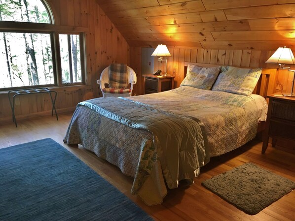 Su amplio dormitorio principal cuenta con una cama queen size y ofrece vistas al agua y al atardecer. Sus habitaciones son acogedoras y están decoradas con encanto rural. Una de las habitaciones ofrece una cama tamaño queen y la otra cuenta con una cama doble. También hay una cama de día en el área del balcón para dormir en exceso. También se incluye leña, 2 televisores (recepción satelital), acceso a Internet de alta velocidad, 2 cunas, 2 sillas altas, lavadora, secadora, parrilla a gas, ropa de cama, teléfono, palas y chalecos salvavidas. Los perros de los huéspedes son bienvenidos aquí, pero no se permite fumar en la cabaña.