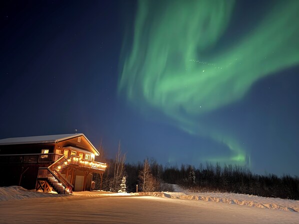 Modern 4-bed home, 10 min from town. Deck with Aurora and mountain views, pond, updated kitchen, master suite with jet tub, radiant floors, fast Wi-Fi. Open concept living and dining. Beautifully renovated inside—cozy, private, and peaceful.
