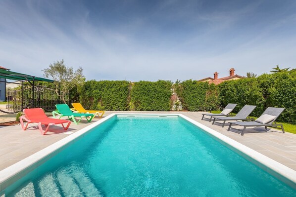Unsere Erwartungen wurden übertroffen. Das Grundstück liegt nach hinten raus und ist nur im Vorbeifahren zu einem anderen Ferienhaus durch das Tor einsehbar! Das Haus ist funktional, aber gemütlich eingerichtet. Durch die Klimaanlagen musste man nicht in warmen Schlafzimmern schlafen. Das Highlight war für uns der Pool, den wir ausgiebig nutzten. Super praktisch auch die Schaukel mit kleinem Klettergerüst für die Kinder. Der Essbereich außen ist mittlerweile überdacht, so dass man dort einen Schattenplatz direkt am Pool hat. Ein bis zwei Restaurants sind fußläufig zu erreichen, ansonsten 5 Fahrminuten entfernt, kann man sich vor Angeboten kaum entscheiden. Der Strand ist in der Nähe und auch die Nähe zu Pula ist unschlagbar. Die Kommunikation mit der Vermieterin war stets sehr freundlich. Alles in Allem ist das Haus absolut weiterzuempfehlen!