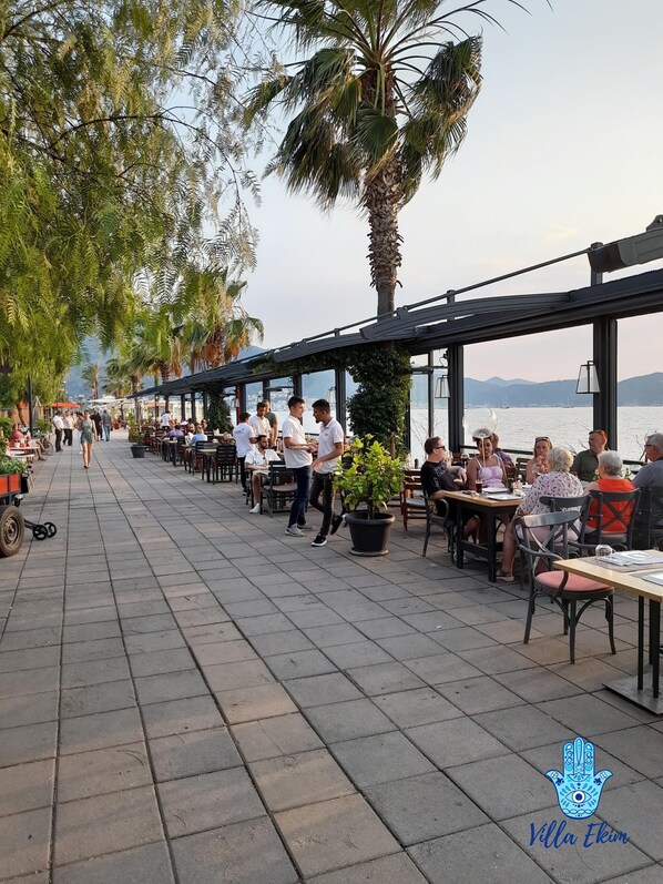Puede caminar por el paseo marítimo y detenerse para almorzar y tomar bebidas en uno de los muchos bares de playa o ver los parapentes aterrizando en la playa. Es considerado como uno de los mejores lugares del mundo para volar en parapente debido a sus vistas panorámicas únicas y la excepcional altura de la montaña Babadag.