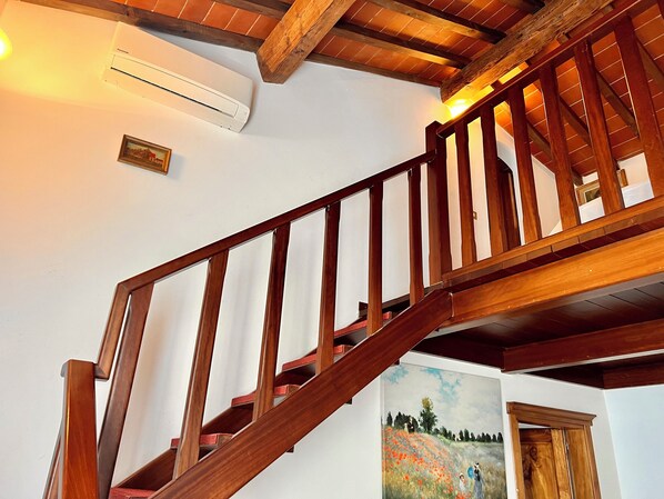 El apartamento está dividido en dos niveles con techo de vigas. Una planta consta de: una entrada con una pequeña ventana que da al jardín trasero, una sala de estar acogedora y luminosa, una cocina totalmente equipada, un pequeño lavadero / lavadora con lavadora y caldera, un baño con ducha y una habitación doble grande con la posibilidad de tener una cama individual para niños. En el entresuelo con suelo de parquet, puede acceder desde una escalera de madera maciza y consta de: un estudio, un espacio abierto con un sofá cama y un baño sin ducha.