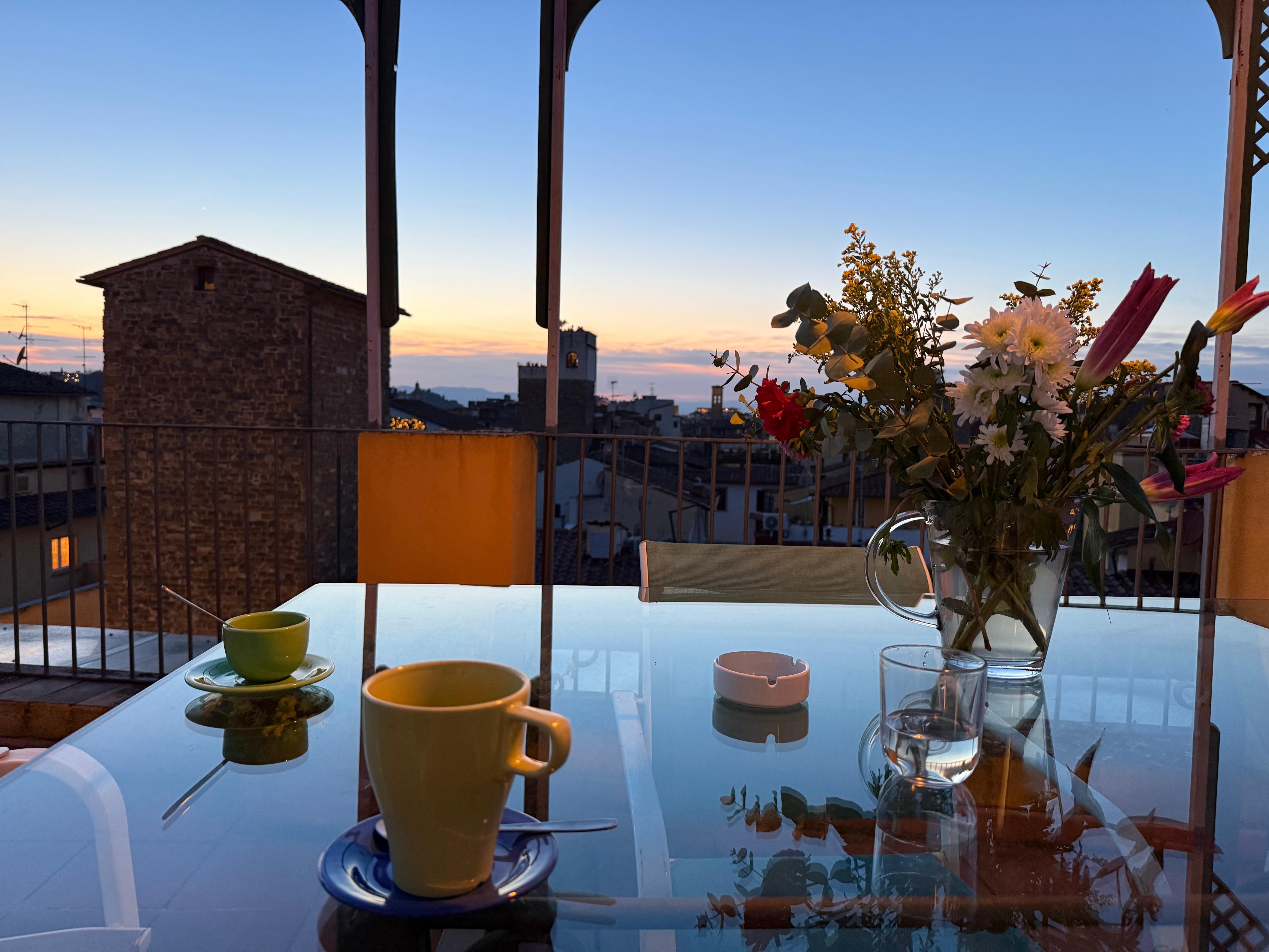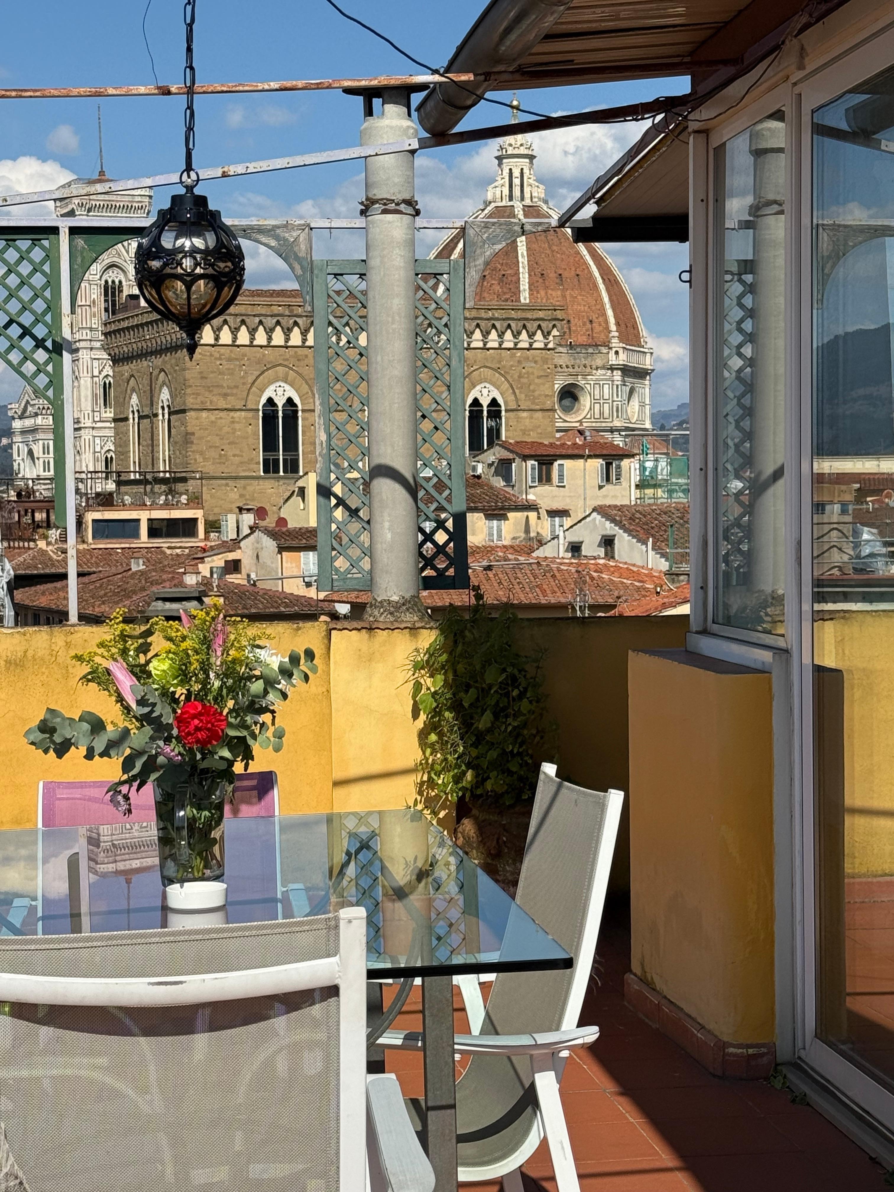 Most amazing stay in Firenze! The patio is exceptional and we enjoyed our coffee there daily, mid day break before going out for the evening, and the end of the night overlooking the city. The expansive views of Florence were exceptional! The church bells ringing, the duomo, Uffizi, other buildings so close! Views of Pitti Palace and Boboli gardens just across the river. Right in the heart of the city but also quiet off a very cute side street with wonderful shops, restaurants, and cafes right outside your door! The interior was perfect for us and the wrap around windows gave us the best view of the city at all times. Curtains for privacy if you wish but we loved just looking out at everything! The size was perfect for us and we loved the authentic feel. The coffee makers were perfect and we used them daily! We had everything we needed here! Bathroom was very clean and no issues at all. We wish we didn’t have to leave! The moment we walked onto the patio I wanted to move to Italy. If and when we return, we will definitely request to stay here again! Also lots of resources were provided to us on arrival about best restaurants, cafes, music, and other places to visit. Cannot say enough about it! We loved it!!!!