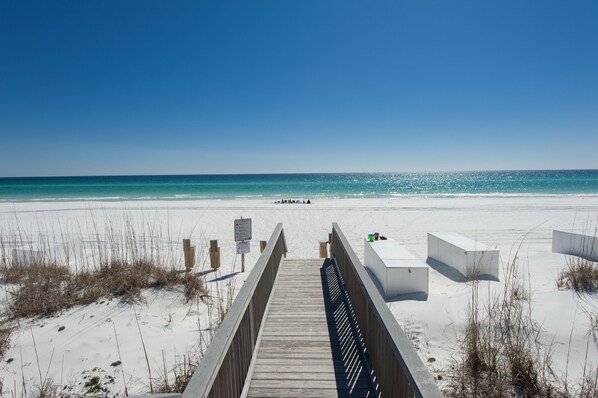 We had a wonderful stay at this condo! This was our first trip to Miramar Beach and we fell in love with it. This condo was perfect for us because we were traveling with our Basset Hound Lily and this condo is on the first floor with direct beach access right across the street. The sunrises are amazing but the sunsets were incredible.This condo was clean and had everything you would need for a week at the beach. It is an added plus that the beach chairs and umbrellas are included with the rental. We loved not having to lug our chairs to and from the beach everyday.The guests/owners that stay at the Maravilla Condos are a wonderful mix of couples young and old and families. Very wonderful vacation, thank you for sharing with us!