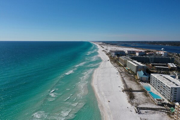Fort Walton Beach, en la isla de Okaloosa, tiene playas de arena blanca como la nieve y aguas cristalinas de color esmeralda. Los condominios en la isla están limitados a seis pisos, lo que hace que haya menos gente en las playas. En Pelican Isle, disfrute de 300 pies de frente de playa privada frente a este complejo de condominios. La refrescante piscina también se calienta durante todo el año para su comodidad.