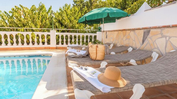 La espléndida zona exterior se divide entre el jardín perfectamente cuidado y una piscina privada vallada, rodeada por tumbonas donde tú y tus familiares podrán tomar el sol todo el tiempo que queráis.