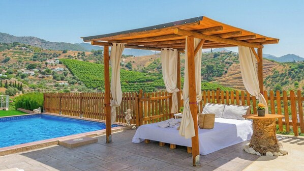 En un nivel más bajo, al que se puede llegar por medios de unos escalones o de una rampa, se encuentra la amplia zona exterior con piscina, tumbonas, parasoles y mobiliario, además de una confortable cama balinesa para descansar y relajarse al máximo nivel. En la zona exterior, también encontrarás un aseo y una mesa de ping-pong.