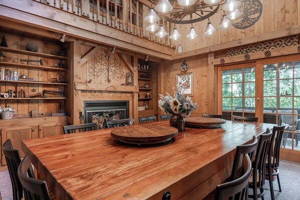 Nuestra casa de tres pisos hecha a medida cuenta con una impresionante gran sala con chimenea de leña y acceso a una gran terraza perfecta para asar y comer al aire libre. La cocina está totalmente equipada con todo lo que necesitas para cocinar comidas caseras para una multitud que incluye muchos platos adicionales, tazas, tazones, tazas y cubiertos para grupos grandes. El comedor alberga una enorme mesa casera con capacidad para 12 personas y acceso al acogedor porche de la pantalla. Con habitaciones (3 suites) y baños en cada nivel de la casa, los huéspedes disfrutarán de espacios tranquilos para descansar y descansar cómodamente. A los niños les encantará el tiempo de juego en "Saplings", su propia sala de juegos secreta escondida debajo de las escaleras y el tamaño adecuado para tus pequeños. *** NUEVO EN JULIO DE 2018 *** Disfrute de nuestra sala de medios "Cedar Theatre" de nivel inferior, relájese y vea una película o un juego. También es nueva la Sala de literas: para 4 personas adicionales en divertidas literas de madera con dos camas individuales. Pase la tarde bajo el cielo estrellado alrededor de la fogata, compartiendo historias de miedo y asando malvaviscos. ¡También salga para disfrutar del jacuzzi para 7 personas! Explore la extensa propiedad con una caminata hacia la histórica Belden School o dé un rápido paseo por el patio hacia "Miner's Way". Disfruta del resplandor del sol naciente desde la terraza, el porche de la pantalla o el balcón y disfruta de las alegres canciones de los pájaros ocupados en los árboles mientras bebes una taza de café recién hecho. O simplemente acomódese debajo de una manta con un buen libro y disfrute del sonido tranquilo de la chimenea crepitante. Nuestra casa tiene mucho que ofrecer a los huéspedes de todas las edades, durante todo el año. Le damos la bienvenida con los brazos abiertos y lo invitamos a regresar cada temporada para disfrutar de todo lo que nuestra casa y Galena tienen para ofrecer.