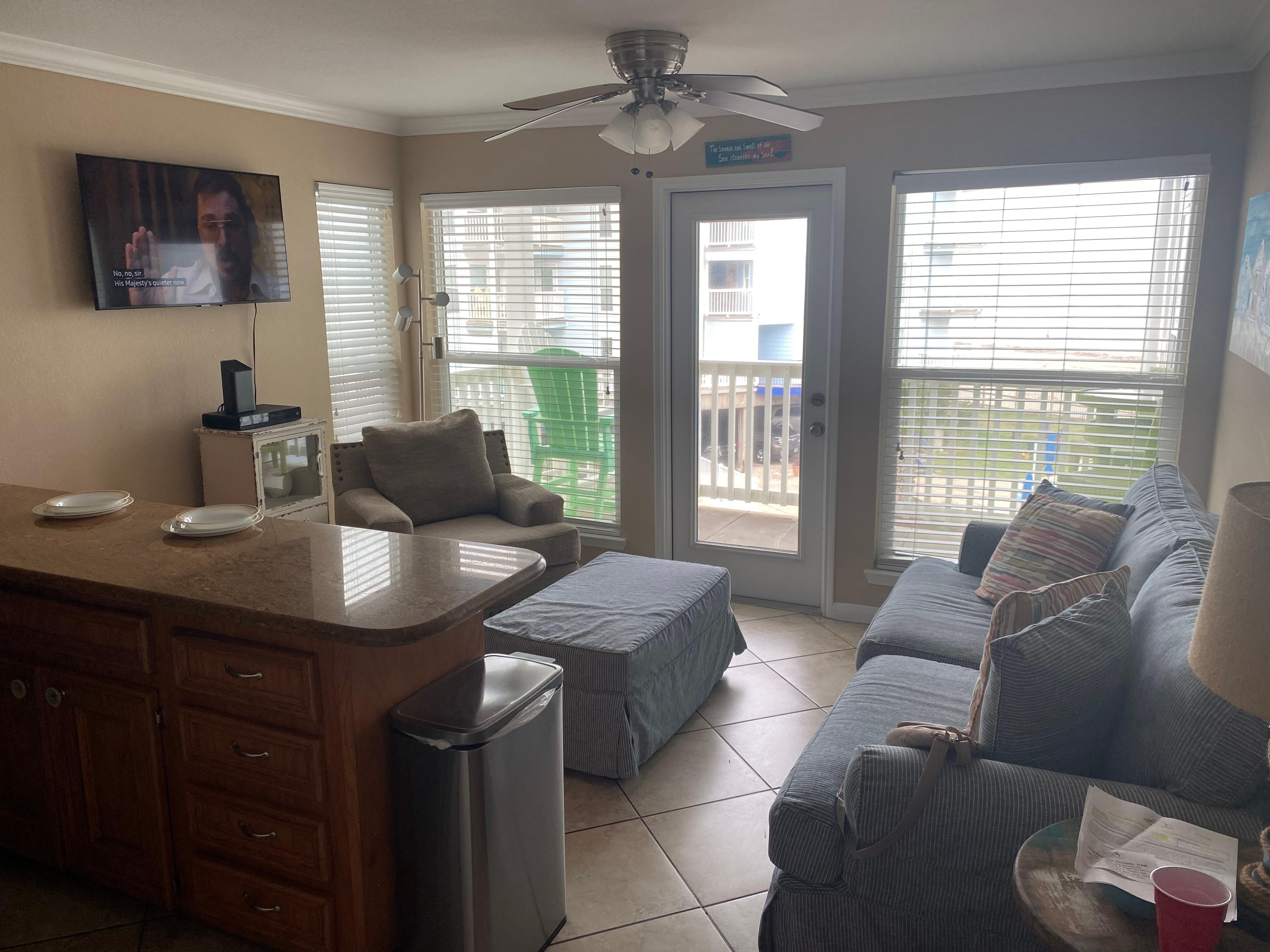 Cuando ingresa a este condominio del segundo piso, le espera un espacio vital moderno y espacioso, con muebles cómodos e impresionantes vistas de la piscina y el océano desde el balcón privado. La sala de estar tiene un televisor de pantalla plana con reproductor de DVD, donde puede relajarse con una buena película al final del día y dejar que la brisa de la isla fluya a través de la puerta del patio.