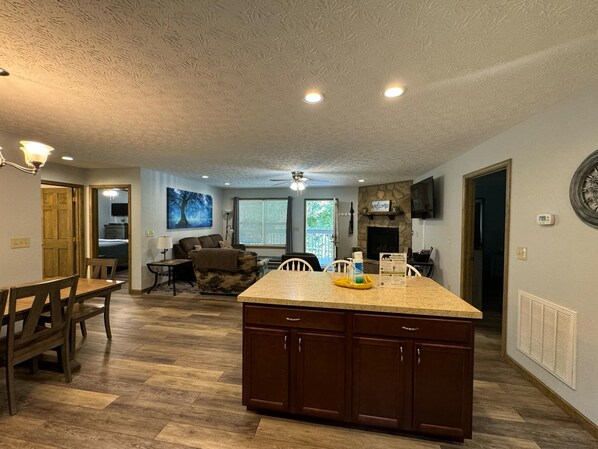 Esta es una casa nueva que cuenta con tres dormitorios y dos baños completos. El dormitorio principal incluye una cama king size, baño privado y TV de 32 ". También tiene una puerta de patio que conduce al porche delantero para que pueda sentarse y escuchar el tranquilo arroyo. En el otro lado de la sala de estar hay dos habitaciones idénticas con camas queen y televisores de 32 ". Entre las dos habitaciones se encuentra el segundo baño completo. La sala de estar, el comedor y la cocina son de concepto abierto. La sala tiene una chimenea a gas, un televisor de 55 "y un reproductor de Blu - Ray. El sofá de la sala de estar es un sofá cama que puede elevar el alojamiento de la casa hasta ocho. La cocina está completamente amueblada y también tiene una lavadora y secadora para su uso. Fuera de la casa, hay una parrilla de carbón JUMBO Park Style de 24 "x 16" si desea cocinar al aire libre. Todos los televisores están conectados a Spectrum Cable y hay internet de alta velocidad para su uso incluido en su estadía.