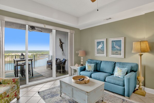 Cuando entras en la unidad de 926 pies cuadrados, encontrarás todas las comodidades del hogar que se te han proporcionado, incluidos televisores de pantalla plana, satélite y Wi-Fi gratis en todo. ¡La sala de estar ofrece el lugar perfecto para relajarse y conversar antes de salir a disfrutar de mariscos locales, una pequeña terapia de compras o darse un chapuzón en la piscina Oasis! ¡Siéntase libre de salir al balcón privado y disfrutar de la cálida brisa con una hermosa vista del canal intracostero y el puerto deportivo justo debajo!