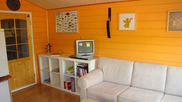 Casa de campo pequeña (30 Kvm), 2 habitaciones: una sala de estar con cocina de 16 Kvm, un dormitorio de 12 Kvm y un baño pequeño con ducha, lavabo e inodoro.