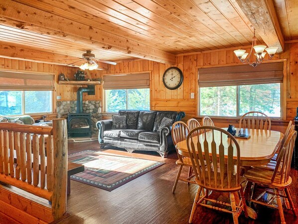 La planta principal tiene una cocina de servicio completo, un comedor y una sala familiar con estufa a leña. Además, una sala de entrada de barro para almacenar y secar su ropa de motos de nieve con una secadora y lavadora. Hay dos cubiertas grandes en el piso principal. Uno en la parte delantera y uno en la parte posterior con una parrilla de barbacoa y el jacuzzi para relajarse después de un día lleno de diversión.