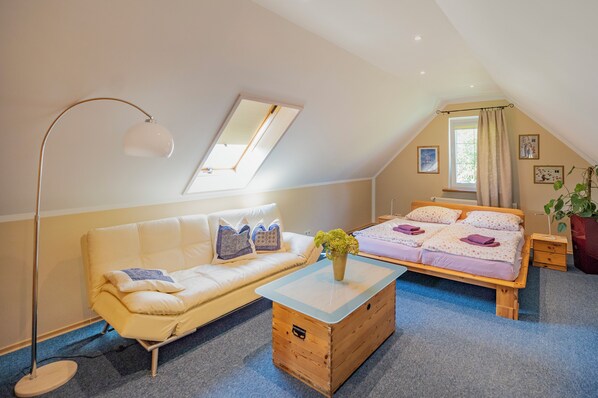El uso de la zona de fitness y bienestar, equipado con una cabina de infrarrojos para dos personas por Physiotherm, dos sillas de relajación calentada por Physiotherm, una bicicleta estática, una máquina elíptica y una máquina de remo está disponible. Para los vehículos de nuestros huéspedes hay cuatro plazas de aparcamiento, dos de ellos con una marquesina doble en la propiedad cerrado disponible. Para cochecitos, bicicletas, motos, etc se puede utilizar de forma gratuita un gran 16m² trastero. Si lo desea, puede utilizar el servicio de pan a cambio de pago.
