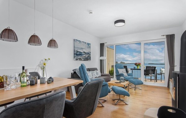 El cuarto de ducha le ayudará a empezar el día con energía. Y cuando entre en el salón-comedor, creerá que aún está soñando: el sol naciente de la mañana le da la bienvenida y el mar Báltico se extiende a sus pies. Una extensión infinita ante ti. Esta bienvenida matutina también está garantizada fuera de los meses más cálidos gracias a los grandes ventanales que van del suelo al techo. Además, la estufa de leña le mimará con un crepitante fuego para que sea realmente acogedor. Además de un segundo televisor, el salón también dispone de un acogedor sofá cama para otra persona.
