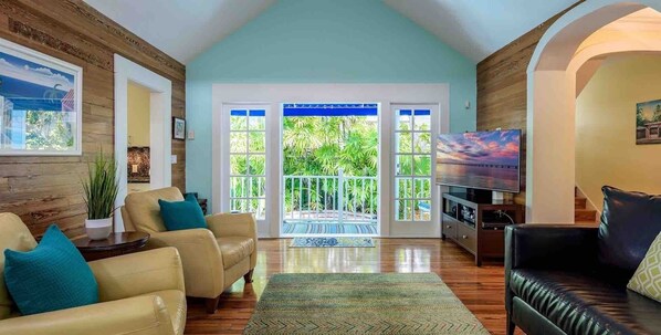La sala de estar y el comedor de la "Maison Tropicale" son de planta abierta, con techos abovedados, puertas francesas y ventanas altas en ambos lados. La segunda sala de estar y su oficina en casa adjunta también son amplias y luminosas. La cocina tiene puertas francesas dobles a la cubierta y está equipada con encimeras de granito, todos los electrodomésticos de acero inoxidable, incluido el refrigerador / congelador Sub-Zero.