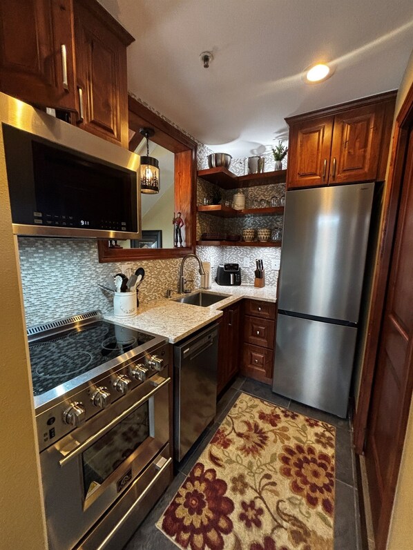 En la cocina encontrará encimeras de granito en losa, gabinetes de cerezo, pisos de madera noble y azulejos, electrodomésticos de acero inoxidable Cuisinart, configuraciones de lugar completas y un montón de extras, y espacio para guardar sus comestibles. En el nivel principal, ¡un baño tipo spa con duchas dobles te esperan! Arriba, encontrarás un medio baño con fabulosas vistas a la montaña y a la pista de esquí.