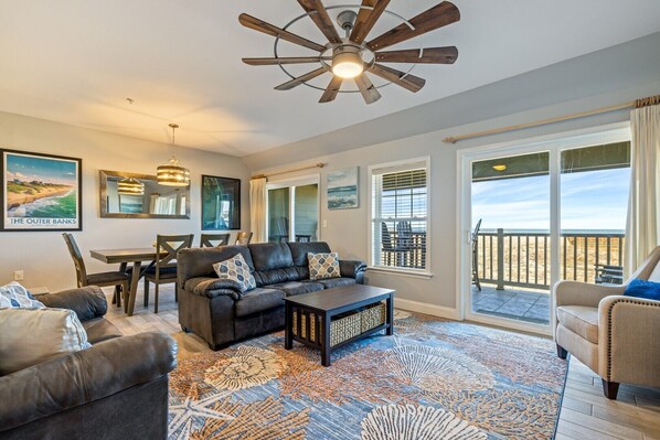 We enjoyed our stay and loved the fact that we were steps from the ocean. It was an easy task to walk out the door and onto a ramp that took us right down to the beach. Our condo was on the first floor so we had a view of the water from our patio but not of the actual beach area which was blocked by the sand dunes. You might be able to see the beach area from the second or third floor. The condo was very clean. I would recommend that you take your own supplies like hand soap, dish soap, laundry detergent, kitchen towels, garbage bags. Those things are not supplied. The plus is each unit has its own storage in the garage and ours was furnished with chairs and an umbrella which was very nice. We were also very close to a lot of attractions like the Jockey Stste park with the sand dunes, Jeanette’s Pier, putt putt, and a dolphin watching cruise. There’s plenty to do and I would recommend staying here