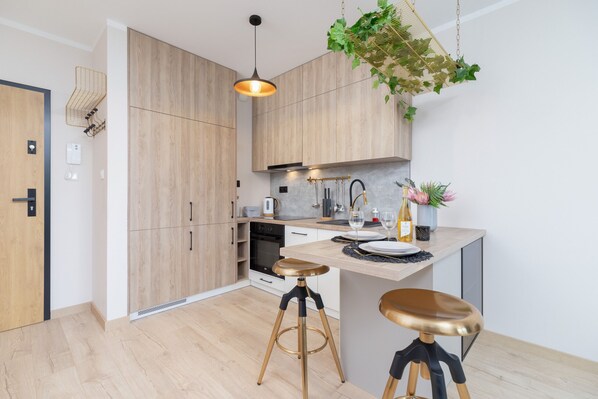 Departamento, 1 habitación, balcón | Cocina privada | Lavavajillas, tetera eléctrica y utensilios de cocina