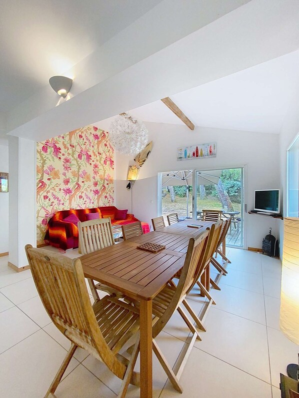Zona tranquila cerca de la playa y comercios. Apreciará esta casa independiente y luminosa, con una decoración cuidada, para la recepción de ocho personas. El área de la cocina está abierta a la sala de estar, que actúa como sala de estar / comedor con zona de comedor. Un gran ventanal con vistas a la terraza y al jardín privado, sin vecinos, se encuentra en la parte posterior de la casa, equipado con muebles de jardín. 1 dormitorio 1 cama doble que se abre a la terraza. Las camas están distribuidas entre las tres habitaciones de la casa y el estudio ubicado en la planta baja. Dos de las habitaciones están equipadas con dos camas individuales o 4 camas individuales, la tercera habitación está equipada con una cama doble (160 cm) y el estudio con un sofá convertible (140 cm). Un cuarto de baño con ducha, lavabo e inodoro separado está disponible en la casa y una ducha con regadera, lavabo e inodoro en el estudio, equipamiento completo con refrigerador y lavadora. Posibilidad de aparcar un vehículo en el suelo. Conexión wifi. La playa está a 400 m, tiendas, restaurantes, heladerías, escuelas de surf a 500 m, golf a 3 km y el lago a 6 km (REF 04071) Se aceptan vales de vacaciones ANCV