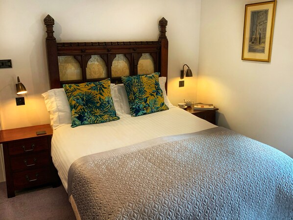 Se han utilizado sillas de biblioteca de cuero de estilo victoriano, alfombras persas, pisos de madera originales recuperados, radiadores de hierro fundido, una media puerta roja, una estufa de leña con una enorme repisa de granito hecha de adoquines de Belfast, armarios antiguos, cómodas y mesas de época.