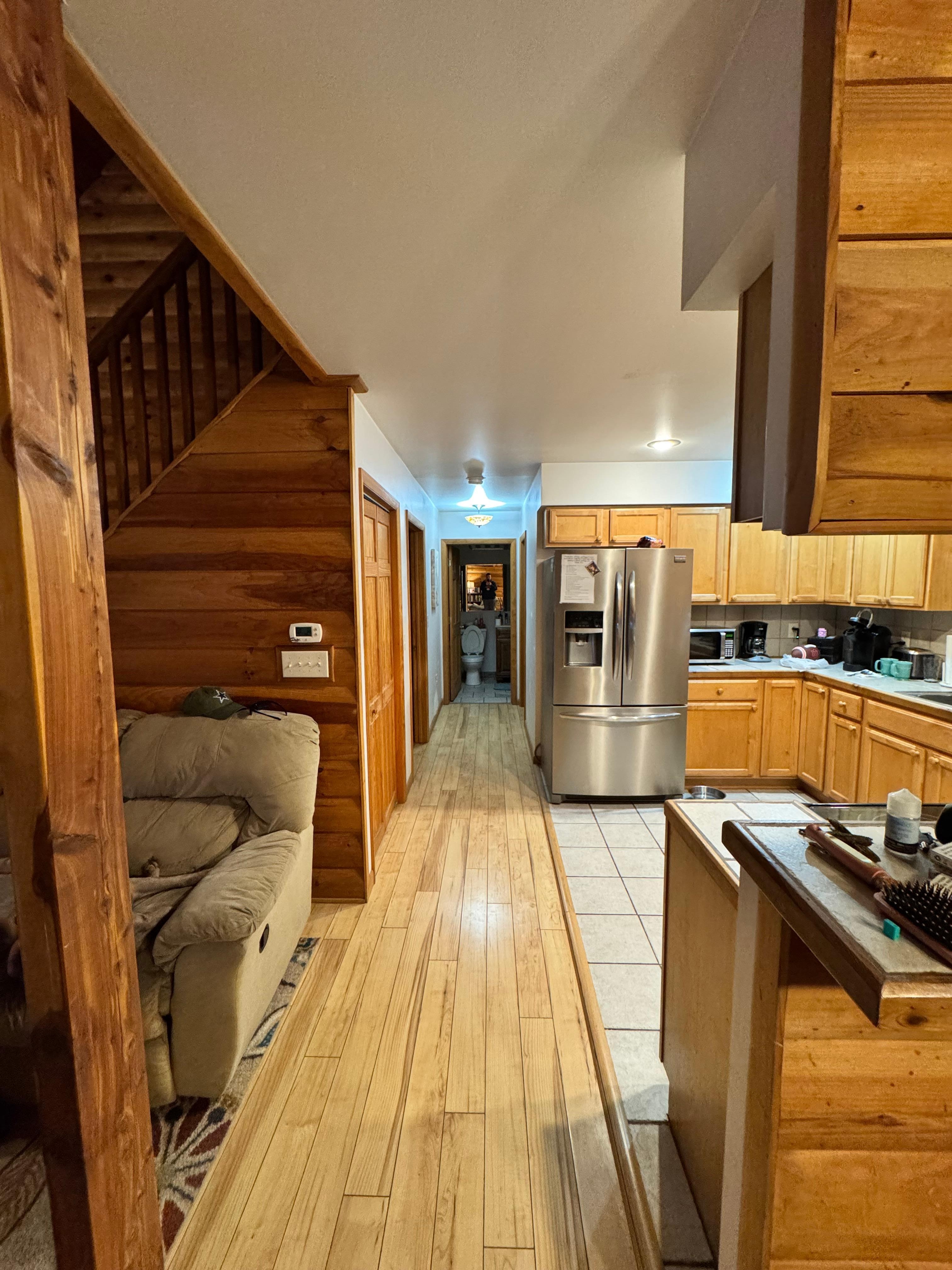 La cabina para 6 personas cómodamente, con 2 dormitorios y un altillo. La habitación de abajo tiene una cama queen, las habitaciones de arriba tienen 2 camas dobles y medio baño, y el loft fuera de la habitación de arriba tiene un futón. El baño de abajo está dividido en 2 habitaciones separadas una al lado de la otra, una incluye el inodoro y el tocador, la otra una ducha y bañera de hidromasaje. (fácil de usar) La cocina cuenta con electrodomésticos actualizados e incluye microondas, tostadora, licuadora y cafetera combinada. El comedor tiene capacidad para 6 personas y conduce al porche cubierto con otra mesa para cenar. Hay una cubierta abierta al lado del porche proyectado que también tiene una mesa y una parrilla de gas. El salón tiene un sofá con 2 lados reclinables, un sillón reclinable separado situado alrededor de la chimenea de gas. El porche delantero tiene un columpio y otros asientos.