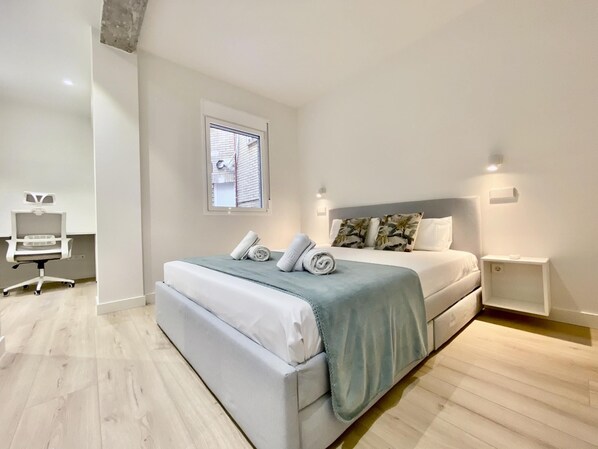 El apartamento cuenta con salón-cocina exterior con balcón y las habitaciones son interiores, para garantizar un buen descanso. Ambos dormitorios cuentan con confortables camas dobles ideales para pasar una temporada en Madrid.