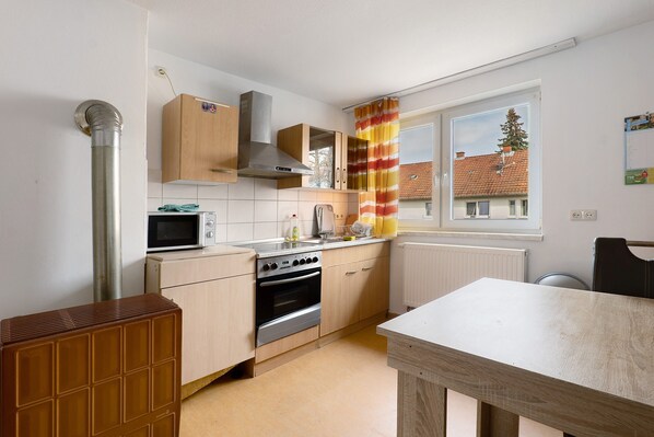 La casa está cerca de la estación (a unos 200 m) y bien comunicada. Tenéis supermercados como Aldi y Rewe (a unos 100 m) y una pequeña tienda turca a poca distancia. El casco antiguo está a unos 15 minutos a pie o 5 minutos en coche.