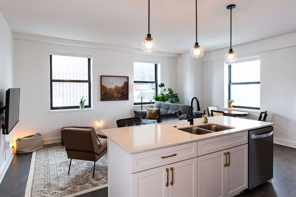 Los habitaciones de este departamento disponen de aire acondicionado, cafetera y tetera y secadora de cabello. El mobiliario se compone de escritorio, silla de escritorio, comedor y isla de cocina. La cocina está equipada con refrigerador, parrilla de estufa, microondas y utensilios de cocina.