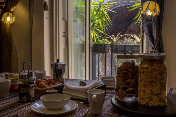 El apartamento ocupa los ambientes abovedados del piso noble del palacio de Caracciolo edificado en el tardo cinquecento. A pocos pasos del decumano mayor del centro histórico de Nápoles, ViaTribunali, en una posición estratégica para descubrir la magia de Nápoles y la milenaria cultura que la atraviesa. La reciente restructuración operada por los propietarios y arquitectos ha logrado un B&B lleno de fascinación con ambientes caracterizados por la amplitud. Antiguo respiro de altos techos abovedados pintados de azul, destacando el fresco de la entrada del palacio bien visible desde el apartamento y del uso de un antiguo balcón en toba asomado al patio.